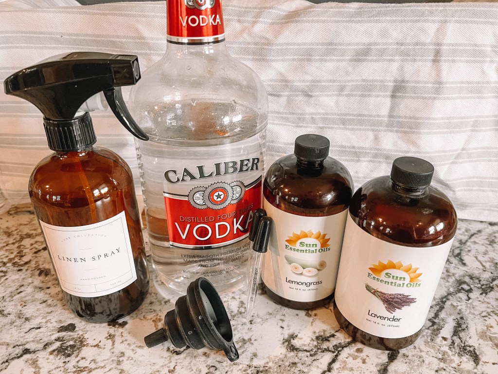 The next two ingredients you’ll need are distilled or purified water and vodka. I already had both of these on hand and didn’t get too fancy with it. Vodka naturally kills bacteria and can be helpful in reducing unpleasant odors. It also dries very quickly and doesn’t leave a strong scent behind. I have learned that lots of household products I like to make myself require some amount of alcohol so I keep a large jug of vodka in my pantry for this exact purpose. I used Caliber Vodka, and I have no complaints.