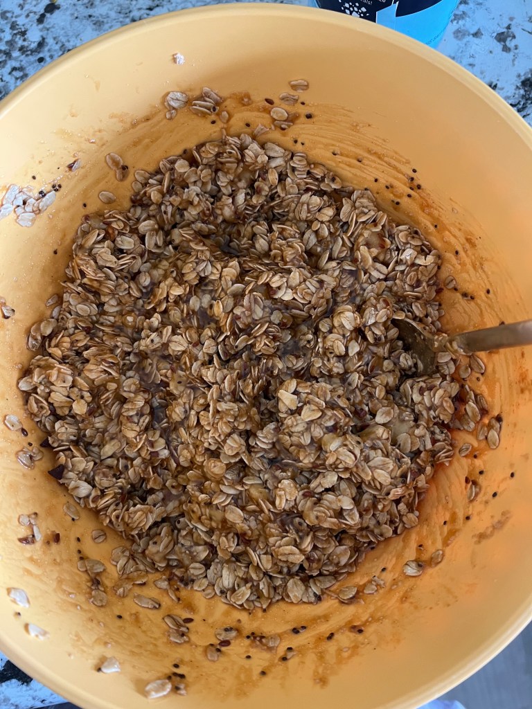 Add wet mixture into large bowl containing dry mixture. Mix thoroughly until everything is evenly coated.
