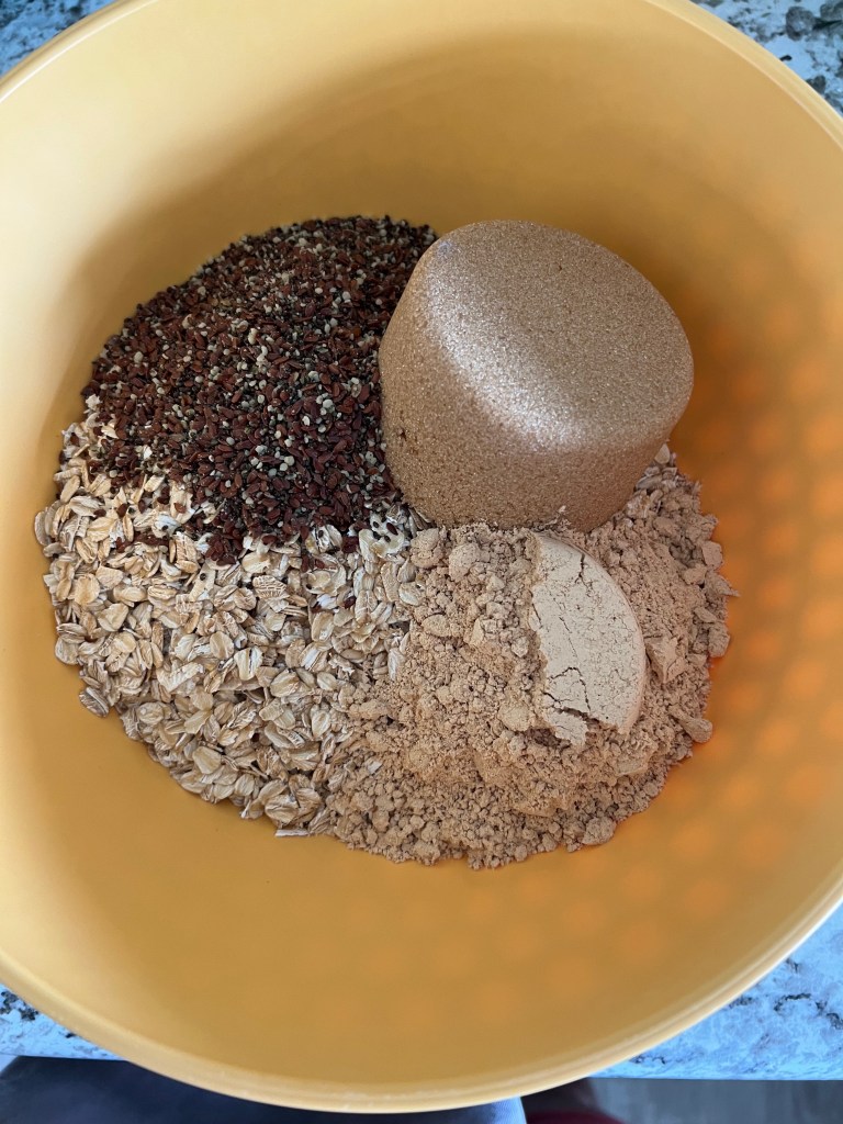Combine dry oatmeal, Rice Krispies, brown sugar, salt, PB Fit powder, and flax/chia/hemp seeds into a large bowl