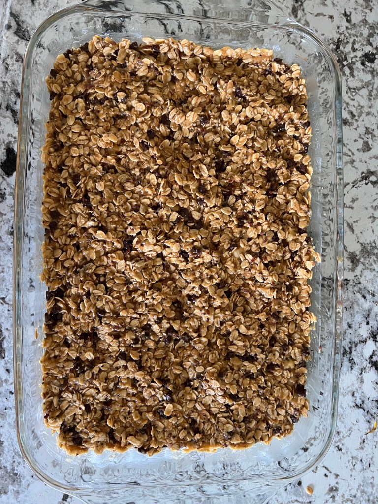 Press mixture into a well greased 9x13in pan.